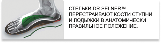 Динамический каркас стелек Dr.Selner служит амортизатором для ключевых суставов (ступня, колено, таз), гася ударную нагрузку от ходьбы по твёрдым поверхностям